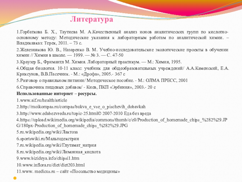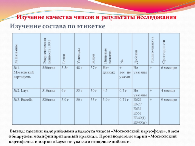 Предмет исследования: качественный состав чипсов на наличие масла, крахмала, калорийность, наличие вредных веществ и влияние их на здоровье человека.