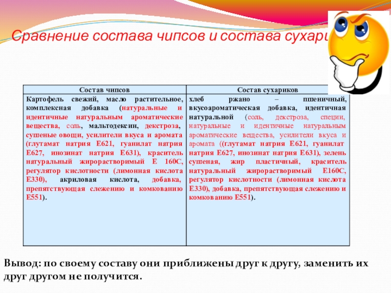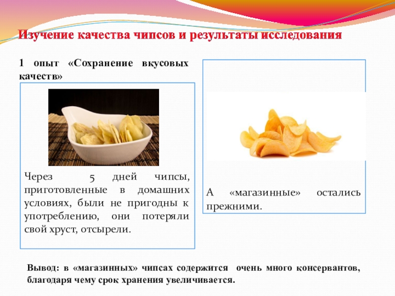 Вывод: в «магазинных» чипсах содержится очень много консервантов, благодаря чему срок хранения увеличивается.