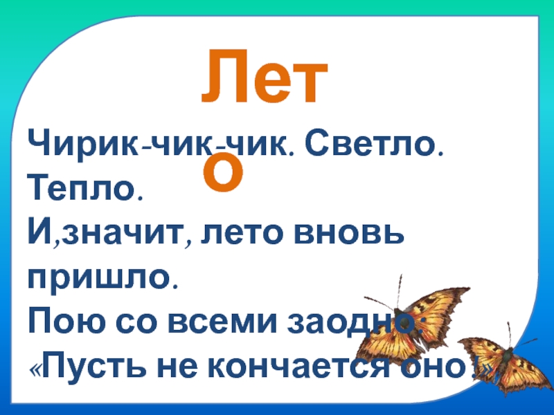 ЛетоЧирик-чик-чик. Светло. Тепло. И,значит, лето вновь пришло. Пою со всеми заодно: «Пусть не кончается оно!»