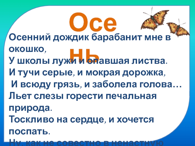 ОсеньОсенний дождик барабанит мне в окошко, У школы лужи и опавшая листва. И тучи серые, и мокрая