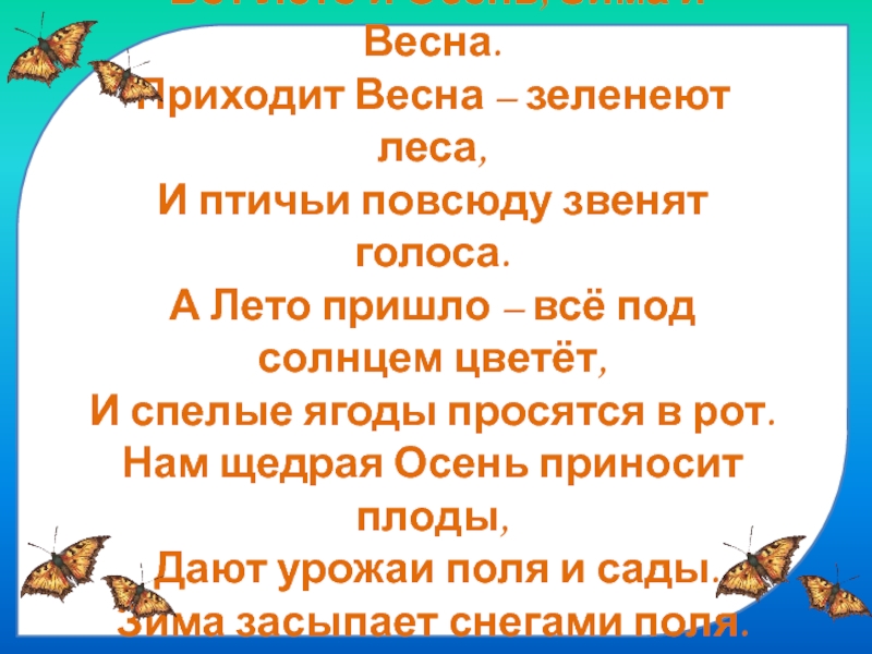 Придумала мать дочерям имена, Вот Лето и Осень, Зима и Весна. Приходит Весна – зеленеют леса, И птичьи повсюду звенят голоса. А Лето пришло – всё под солнцем цветёт, И спелые ягоды просятся в рот. Нам