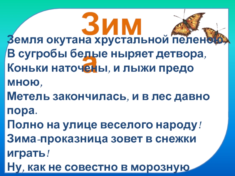 Зима Земля окутана хрустальной пеленою, В сугробы белые ныряет детвора, Коньки наточены, и лыжи предо мною, Метель