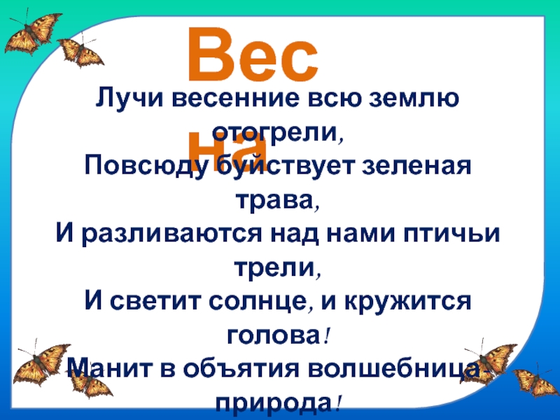 ВеснаЛучи весенние всю землю отогрели, Повсюду буйствует зеленая трава, И разливаются над нами птичьи трели, И светит