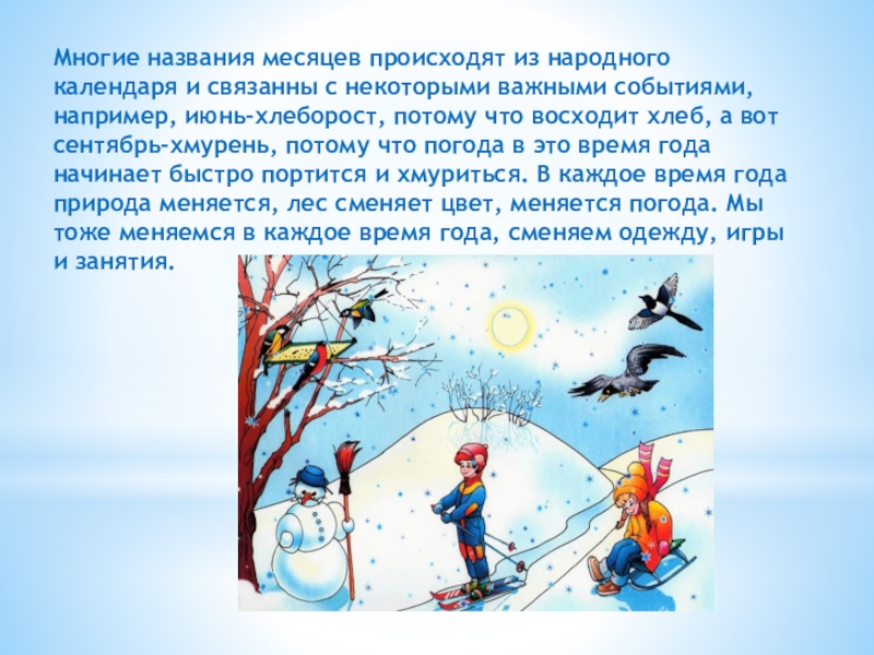 важными событиями, например, июнь-хлеборост, потому что восходит хлеб, а вот сентябрь-хмурень, потому что погода в это время года начинает быстро портится и хмуриться. В каждое время года природа меняется, лес сменяет цвет, меняется погода. Мы тоже меняемся в каждое время года, сменяем одежду, игры и занятия.