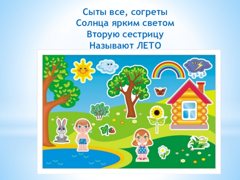 Сыты все, согретыСолнца ярким светомВторую сестрицуНазывают ЛЕТО