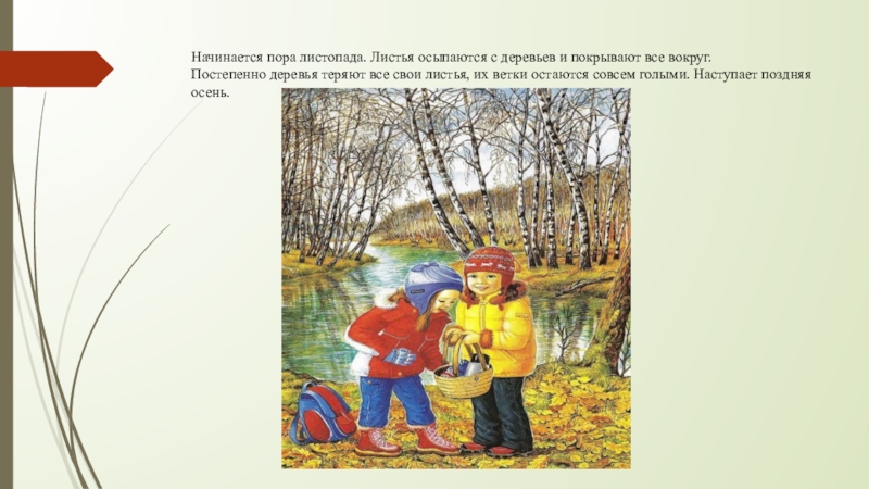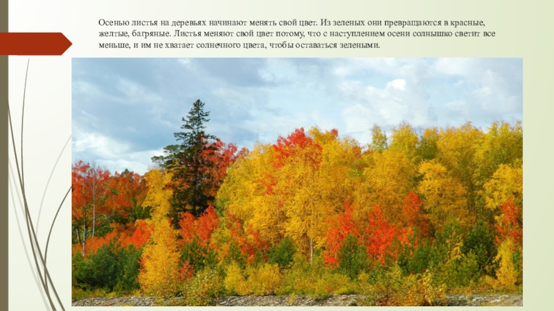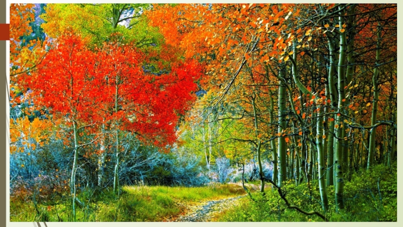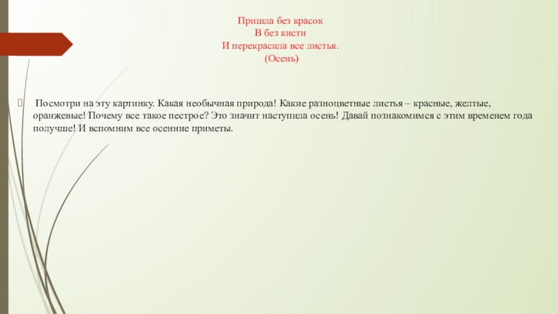 Посмотри на эту картинку. Какая необычная природа! Какие разноцветные листья – красные, желтые, оранжевые! Почему все такое пестрое? Это значит наступила осень! Давай познакомимся с этим временем года получше! И вспомним все осенние приметы.