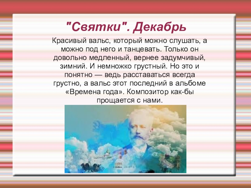 танцевать. Только он довольно медленный, вернее задумчивый, зимний. И немножко грустный. Но это и понятно — ведь расставаться всегда грустно, а вальс этот последний в альбоме «Времена года». Композитор как-бы прощается с нами.
