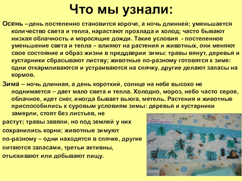 Зима – ночь длинная, а день короткий, солнце на небе высоко не поднимается – дает мало света и тепла. Холодно, мороз, небо часто серое, облачное, идет снег, иногда бывает вьюга, метель. Растения и животные приспособились к суровым условиям зимы: деревья и кустарники замерли, стоят без листьев, не