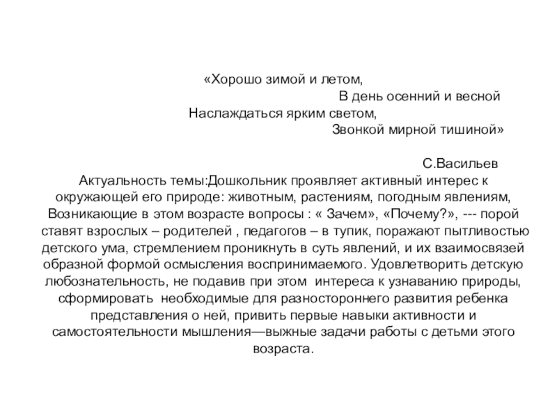 Актуальность темы:Дошкольник проявляет активный интерес к окружающей его природе: животным, растениям, погодным явлениям, Возникающие в этом возрасте вопросы : « Зачем», «Почему?», --- порой ставят взрослых – родителей , педагогов – в тупик, поражают пытливостью детского ума, стремлением проникнуть в суть явлений, и их взаимосвязей образной формой осмысления воспринимаемого. Удовлетворить детскую любознательность, не подавив при этом интереса к узнаванию природы, сформировать необходимые для разностороннего развития ребенка представления о ней, привить первые навыки активности и самостоятельности мышления—выжные задачи работы с детьми этого возраста.