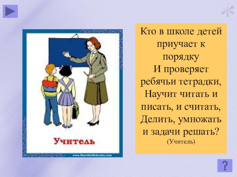Кто в школе детей приучает к порядкуИ проверяет ребячьи тетрадки,Научит читать и писать, и считать,Делить, умножать и