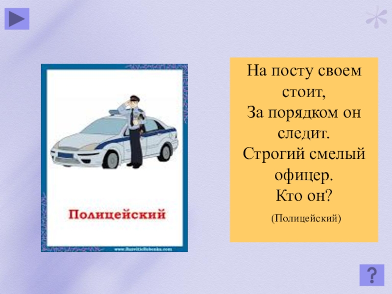 На посту своем стоит,За порядком он следит.Строгий смелый офицер.Кто он? (Полицейский)