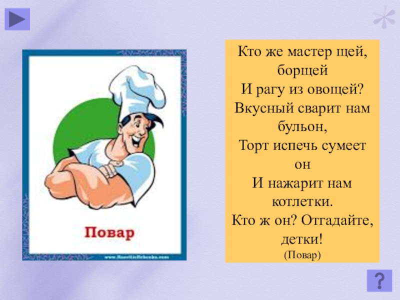 Кто же мастер щей, борщейИ рагу из овощей?Вкусный сварит нам бульон,Торт испечь сумеет онИ нажарит нам котлетки.Кто