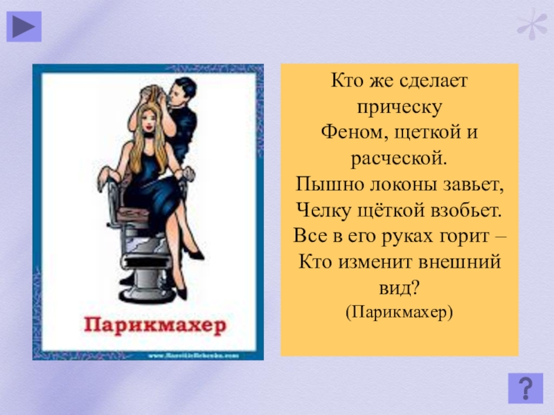 Кто же сделает прическуФеном, щеткой и расческой.Пышно локоны завьет,Челку щёткой взобьет.Все в его руках горит –Кто изменит