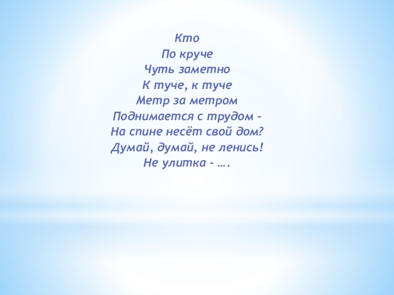 КтоПо кручеЧуть заметноК туче, к тучеМетр за метромПоднимается с трудом –На спине несёт свой дом?Думай, думай, не