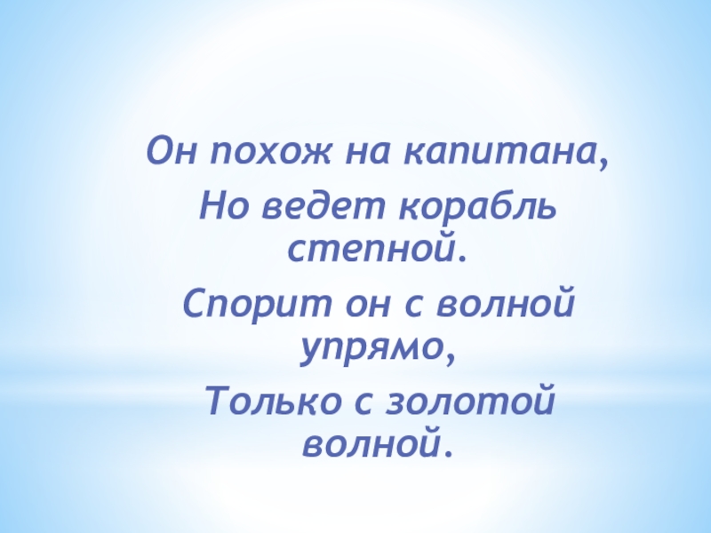 Он похож на капитана,Но ведет корабль степной.Спорит он с волной упрямо,Только с золотой волной.