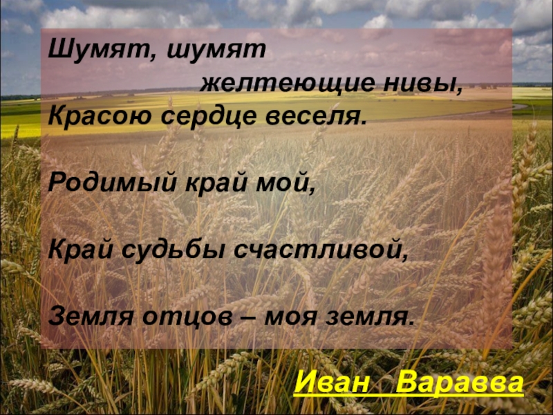 Шумят, шумят           желтеющие нивы,Красою сердце веселя.Родимый край