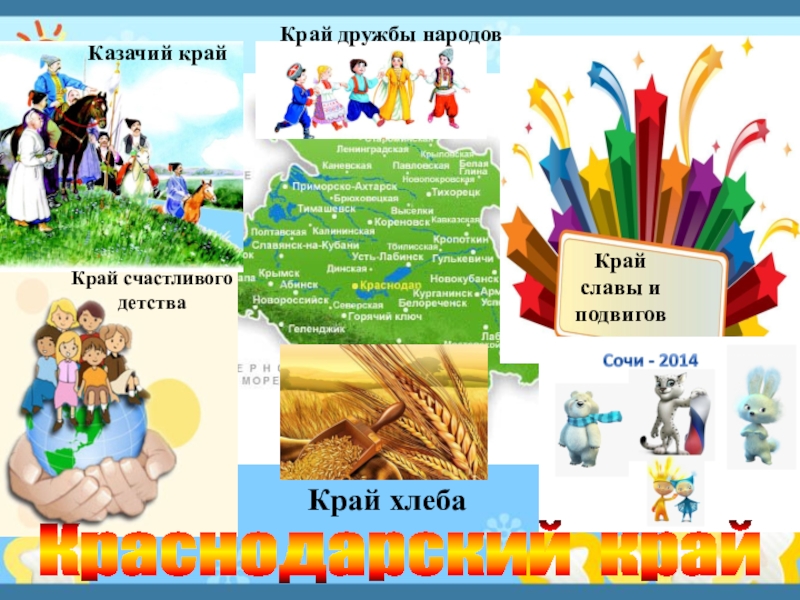 Край славы и подвигов Казачий край Край счастливого детстваКрай дружбы народовКрай хлебаКраснодарский край