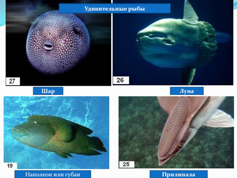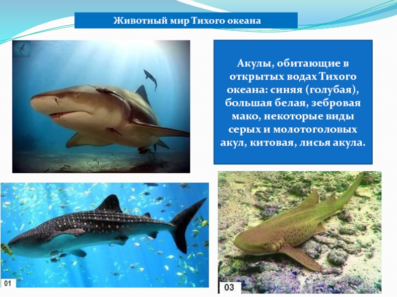 синяя (голубая), большая белая, зебровая мако, некоторые виды серых и молотоголовых акул, китовая, лисья акула.