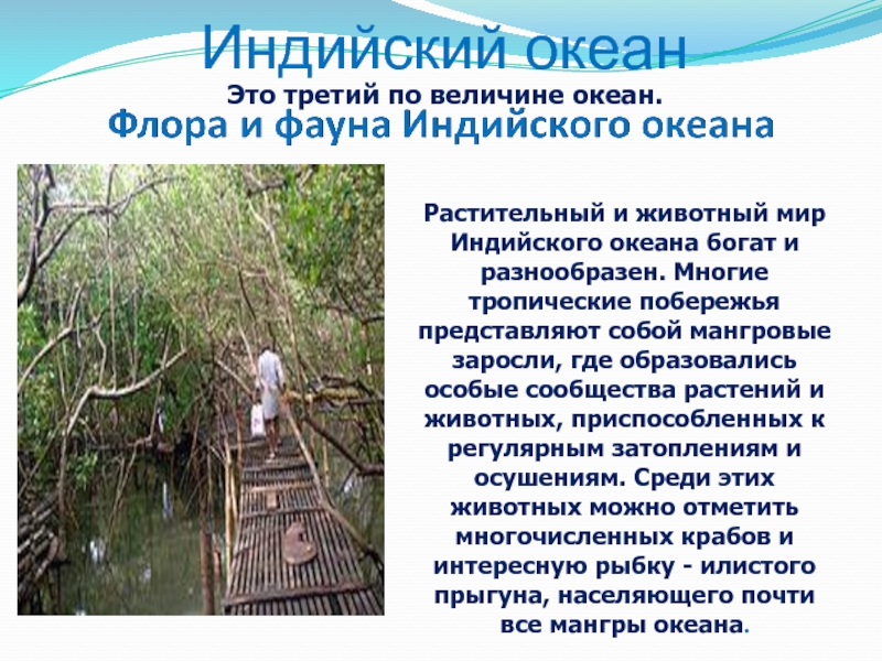 океана богат и разнообразен. Многие тропические побережья представляют собой мангровые заросли, где образовались особые сообщества растений и животных, приспособленных к регулярным затоплениям и осушениям. Среди этих животных можно отметить многочисленных крабов и интересную рыбку - илистого прыгуна, населяющего почти все мангры океана.