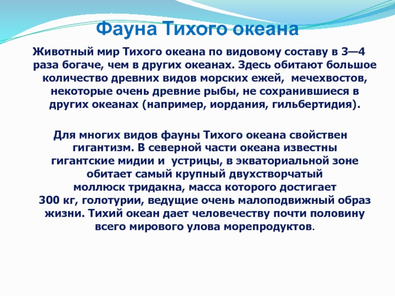 Для многих видов фауны Тихого океана свойствен гигантизм. В северной части океана известны гигантские мидии и устрицы, в экваториальной зоне обитает самый крупный двухстворчатый моллюск тридакна, масса которого достигает 300 кг, голотурии, ведущие очень малоподвижный образ жизни. Тихий океан дает человечеству почти половину всего мирового улова морепродуктов.