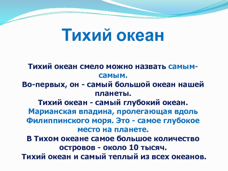 Тихий океан - самый глубокий океан. Марианская впадина, пролегающая вдоль Филиппинского моря. Это - самое глубокое место на планете.