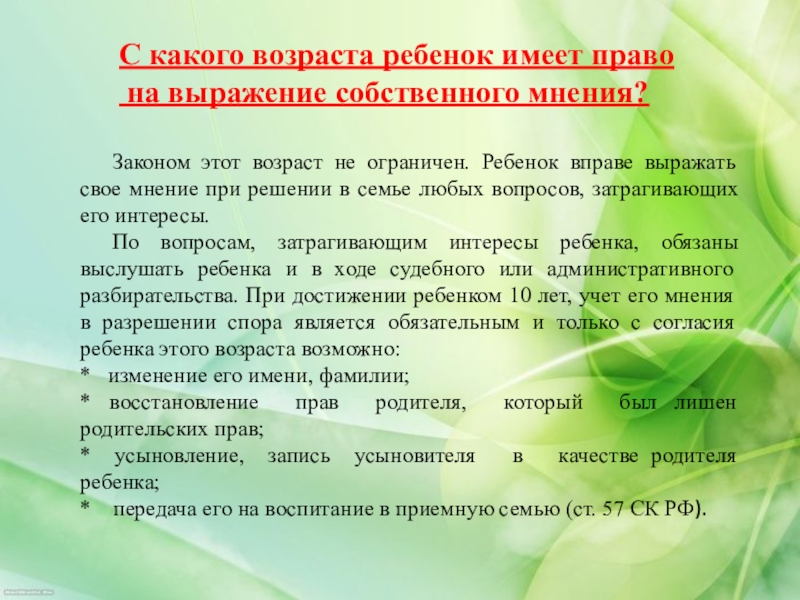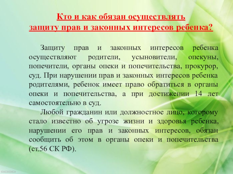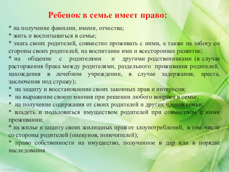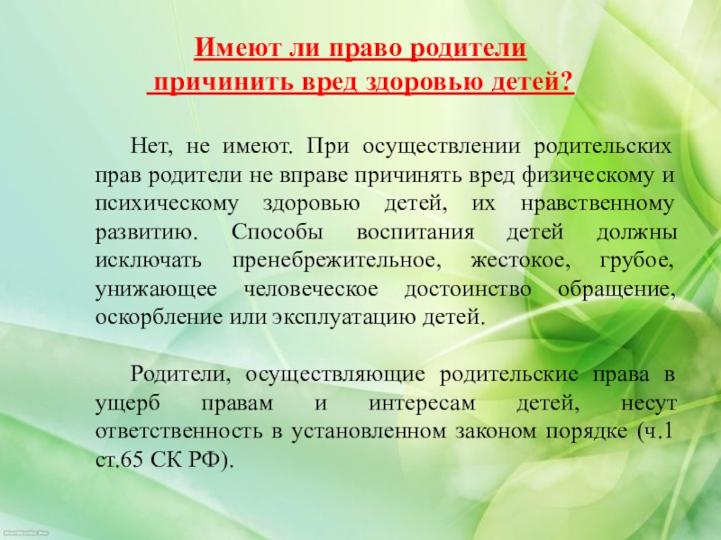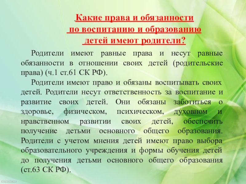 Родители имеют право и обязаны воспитывать своих детей. Родители несут ответственность за воспитание и развитие своих детей. Они обязаны заботиться о здоровье, физическом, психическом, духовном и нравственном развитии своих детей, обеспечить получение детьми основного общего образования. Родители с учетом мнения детей имеют право выбора образовательного учреждения и формы обучения детей до получения детьми основного общего образования (ст.63 СК РФ).