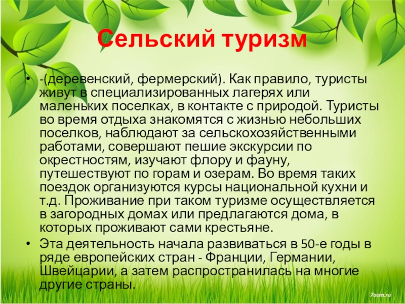 или маленьких поселках, в контакте с природой. Туристы во время отдыха знакомятся с жизнью небольших поселков, наблюдают за сельскохозяйственными работами, совершают пешие экскурсии по окрестностям, изучают флору и фауну, путешествуют по горам и озерам. Во время таких поездок организуются курсы национальной кухни и т.д. Проживание при таком туризме осуществляется в загородных домах или предлагаются дома, в которых проживают сами крестьяне.