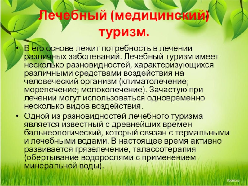 заболеваний. Лечебный туризм имеет несколько разновидностей, характеризующихся различными средствами воздействия на человеческий организм (климатолечение; морелечение; молоколечение). Зачастую при лечении могут использоваться одновременно несколько видов воздействия.