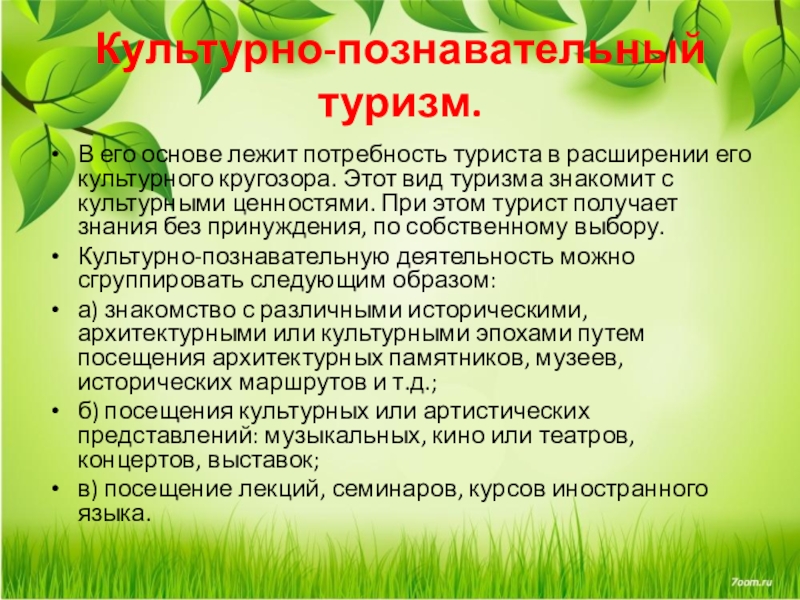 культурного кругозора. Этот вид туризма знакомит с культурными ценностями. При этом турист получает знания без принуждения, по собственному выбору.