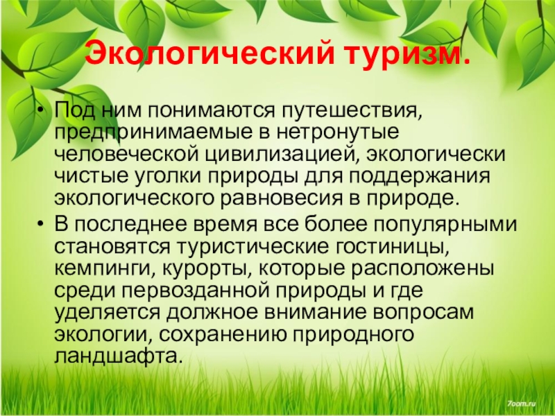 В последнее время все более популярными становятся туристические гостиницы, кемпинги, курорты, которые расположены среди первозданной природы и где уделяется должное внимание вопросам экологии, сохранению природного ландшафта.