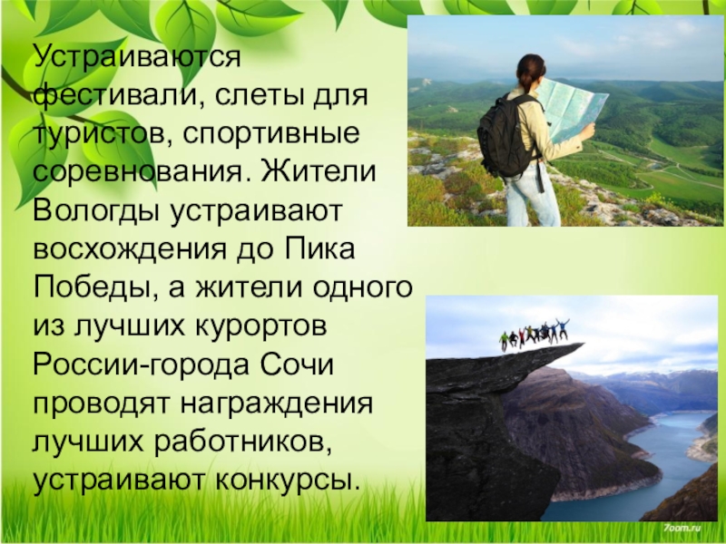 Слайд 7Устраиваются фестивали, слеты для туристов, спортивные соревнования. Жители Вологды устраивают восхождения