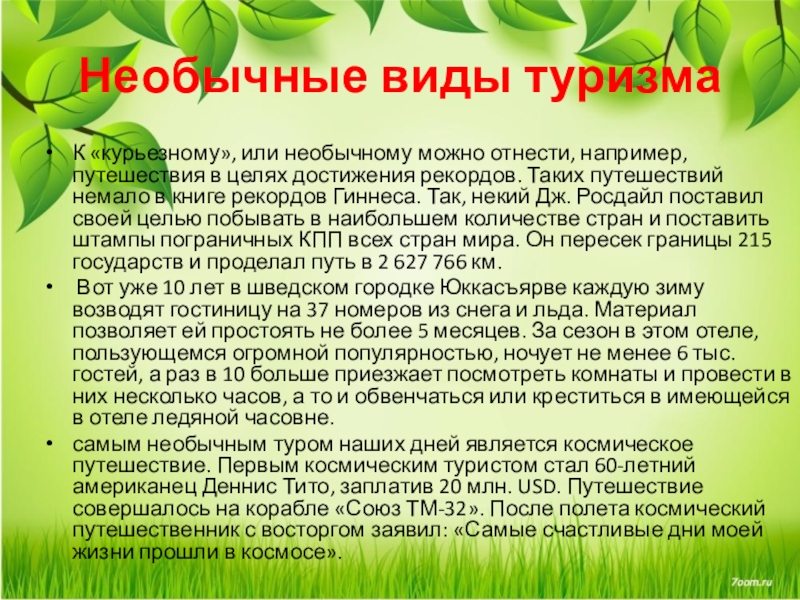 самым необычным туром наших дней является космическое путешествие. Первым космическим туристом стал 60-летний американец Деннис Тито, заплатив 20 млн. USD. Путешествие совершалось на корабле «Союз ТМ-32». После полета космический путешественник с восторгом заявил: «Самые счастливые дни моей жизни прошли в космосе».