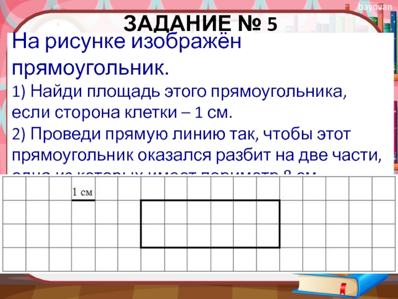 2) Проведи прямую линию так, чтобы этот прямоугольник оказался разбит на две части, одна из которых имеет периметр 8 см.