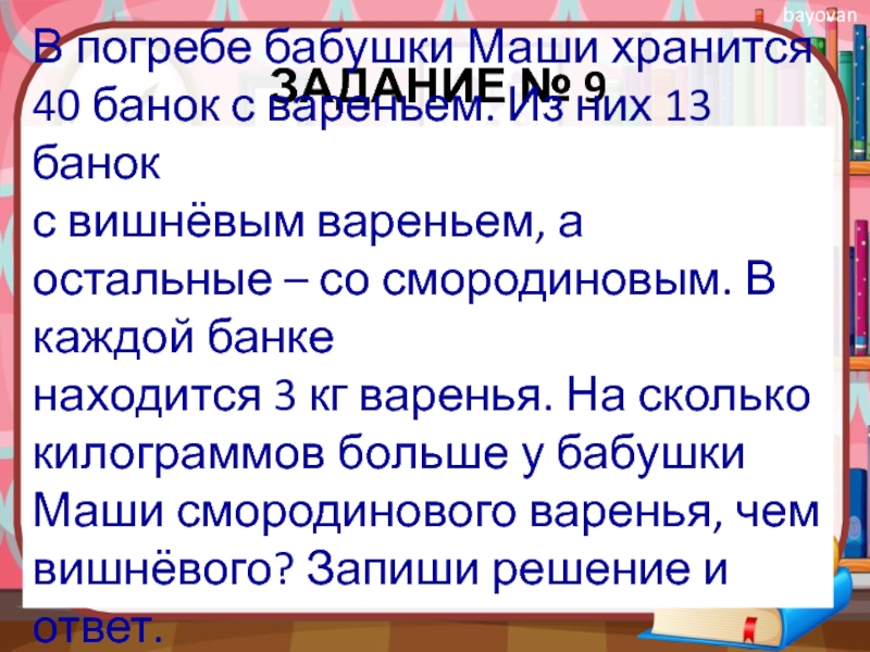 находится 3 кг варенья. На сколько килограммов больше у бабушки Маши смородинового варенья, чем вишнёвого? Запиши решение и ответ.