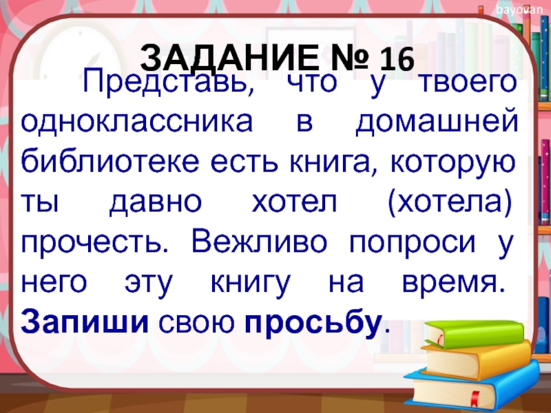 твоего одноклассника в домашней библиотеке есть книга, которую ты давно хотел (хотела) прочесть. Вежливо попроси у него эту книгу на время. Запиши свою просьбу.