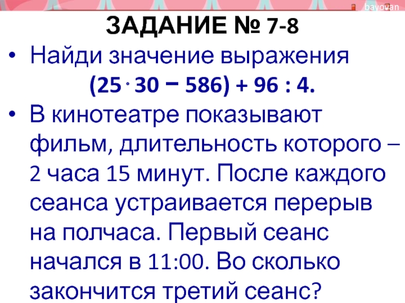 В кинотеатре показывают фильм, длительность которого – 2 часа 15 минут. После каждого сеанса устраивается перерыв на полчаса. Первый сеанс начался в 11:00. Во сколько закончится третий сеанс?