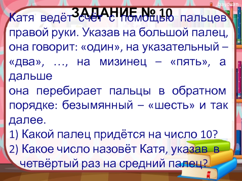 на большой палец, она говорит: «один», на указательный – «два», …, на мизинец – «пять», а дальше