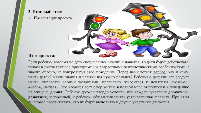 и навыков, то дети будут действовать только в соответствии с присущими им возрастными психологическими особенностями, а значит, опасно, не контролируя своё поведение. Перед нами встаёт вопрос: как и чему учить детей? Какие знания и навыки им нужно привить? Ребёнка с детских лет следует учить, управлять своими желаниями, правильно относиться к понятиям «можно», «надо», «нельзя». Это касается всех сфер жизни, в полной мере относится и к поведению на улице и дороге. Ребёнок должен твёрдо усвоить, что каждый участник дорожного движения, и взрослый, и ребёнок, обязан выполнять установленные правила. При этом он вправе рассчитывать, что их будут выполнять и другие участники движения.
