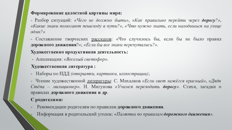 - Чтение художественной литературы: С. Михалков «Если свет зажёгся красный», «Дядя Стёпа – милиционер». Н. Мигунова «Учимся переходить дорогу». Стихи, загадки о правилах дорожного движения и др.