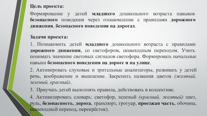 1. Познакомить детей младшего дошкольного возраста с правилами дорожного движения, со светофором, пешеходным переходом. Учить понимать значение световых сигналов светофора. Формировать начальные навыки безопасного поведения на дороге и на улице.