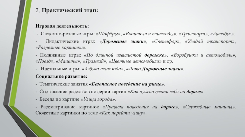 - Подвижные игры: «По длинной извилистой дорожке», «Воробушки и автомобиль», «Поезд», «Машины», «Трамвай», «Цветные автомобили» и др.