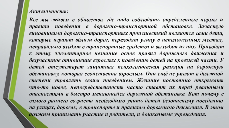 правила поведения в дорожно-транспортной обстановке. Зачастую виновниками дорожно-транспортных происшествий являются сами дети, которые играют вблизи дорог, переходят улицу в неположенных местах, неправильно входят в транспортные средства и выходят из них. Приводят к этому элементарное незнание основ правил дорожного движения и безучастное отношение взрослых к поведению детей на проезжей части. У детей отсутствует защитная психологическая реакция на дорожную обстановку, которая свойственна взрослым. Они ещё не умеют в должной степени управлять своим поведением. Желание постоянно открывать что-то новое, непосредственность часто ставят их перед реальными опасностями в быстро меняющейся дорожной обстановке. Вот почему с самого раннего возраста необходимо учить детей безопасному поведению на улицах, дорогах, в транспорте и правилам дорожного движения. В этом должны принимать участие и родители, и дошкольные учреждения.