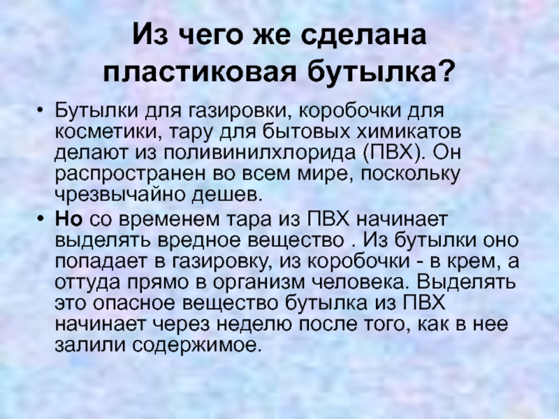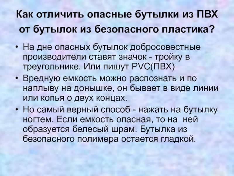 На дне опасных бутылок добросовестные производители ставят значок - тройку в треугольнике. Или пишут PVC(ПВХ)