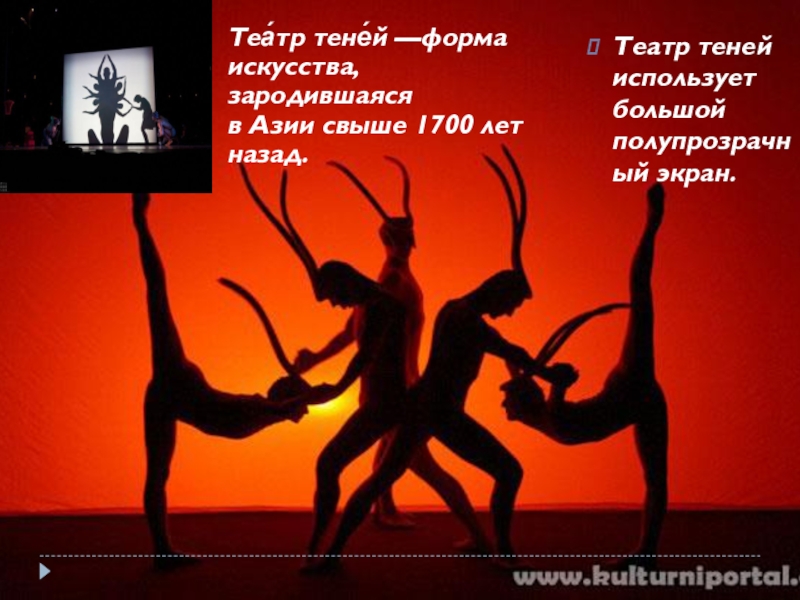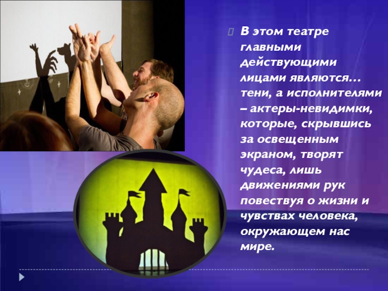 Слайд 6В этом театре главными действующими лицами являются… тени, а исполнителями –