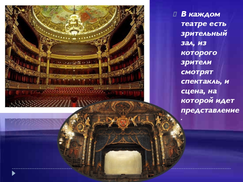 Слайд 3В каждом театре есть зрительный зал, из которого зрители смотрят спектакль,