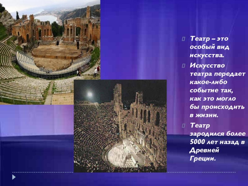 Театр – это особый вид искусства.Искусство театра передает какое-либо событие так, как это могло бы происходить в жизни.Театр зародился более 5000 лет назад в Древней Греции.