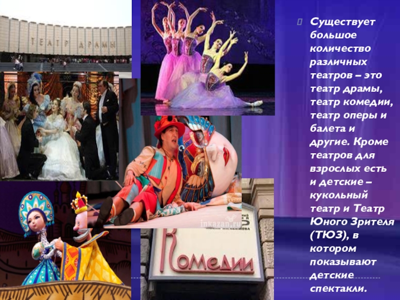 Существует большое количество различных театров – это театр драмы, театр комедии, театр оперы и балета и другие.