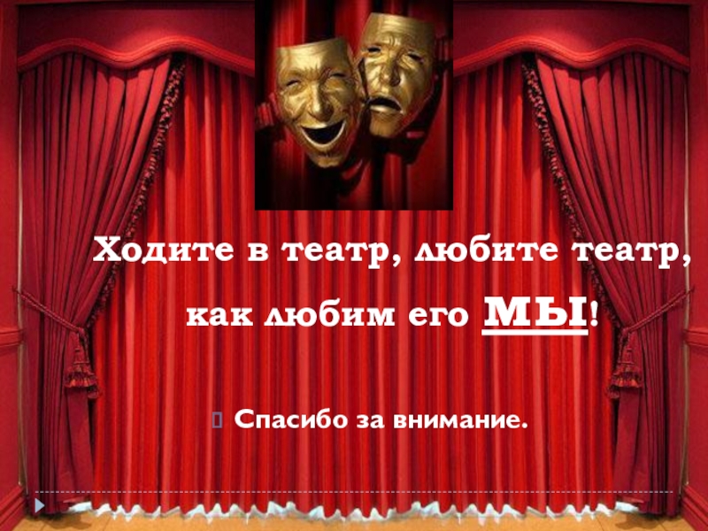 Ходите в театр, любите театр, как любим его мы!Спасибо за внимание.
