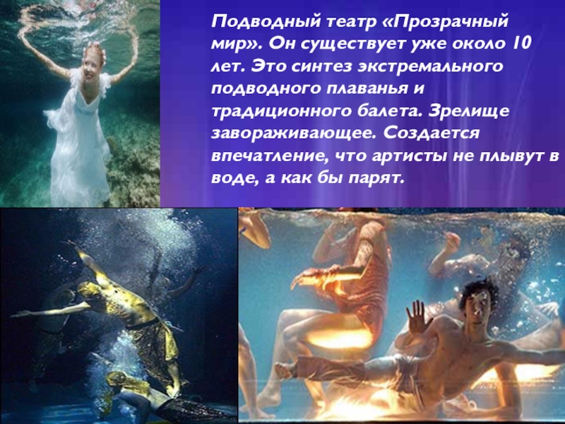 Подводный театр «Прозрачный мир». Он существует уже около 10 лет. Это синтез экстремального подводного плаванья и традиционного