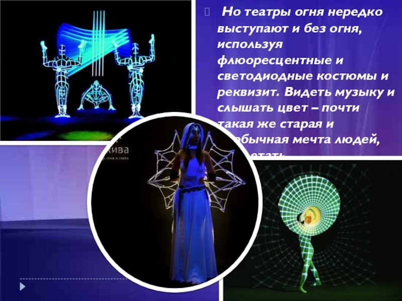 Слайд 8 Но театры огня нередко выступают и без огня, используя флюоресцентные